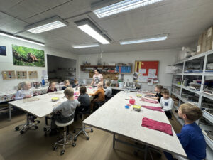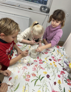 Jejich výtvory byly v keramické peci vypáleny, a na začátku prosince jsme se do Domečku vrátili podruhé – tentokrát, aby si děti své ozdoby naglazovaly a dodaly jim barevný lesk.