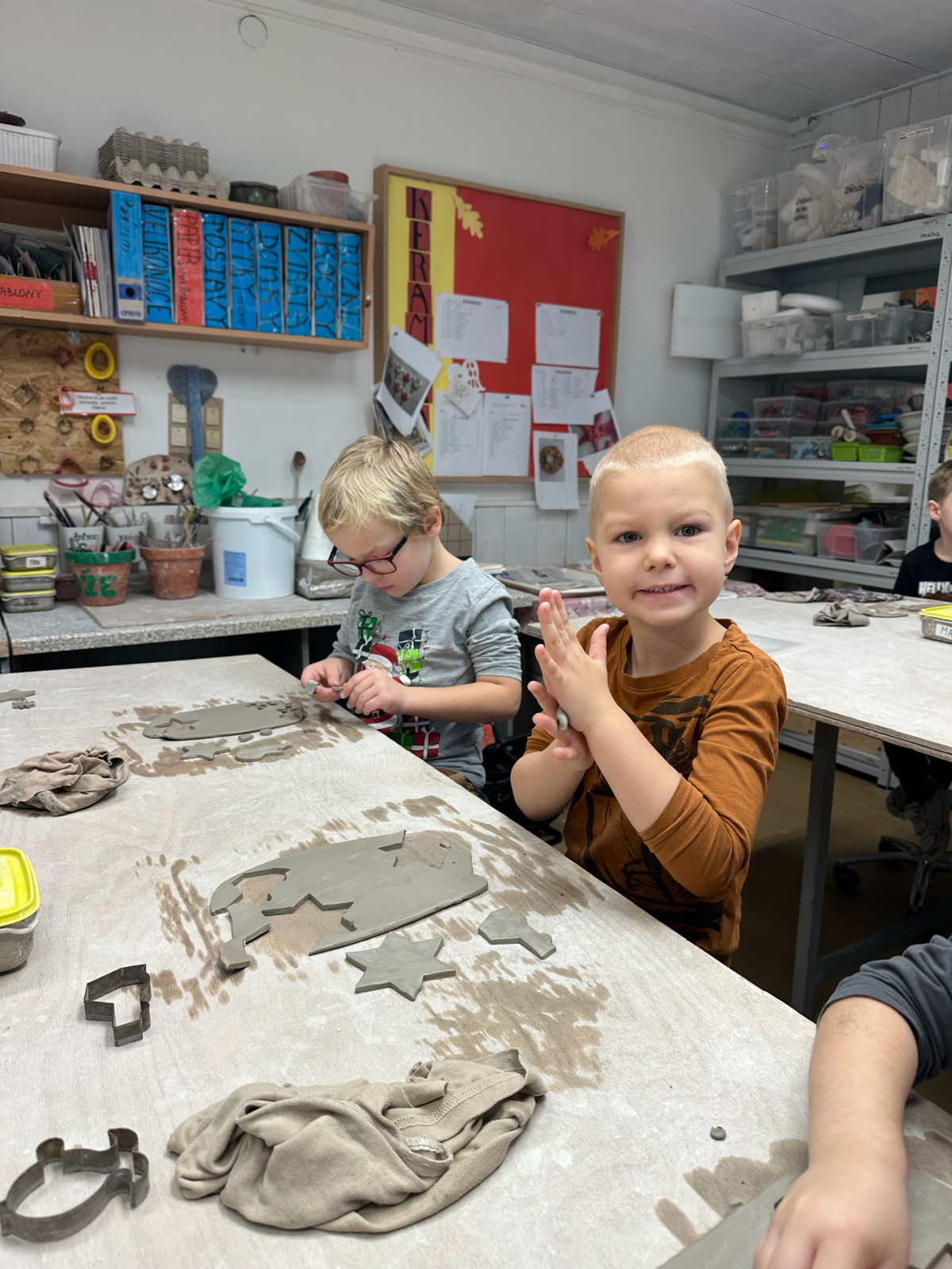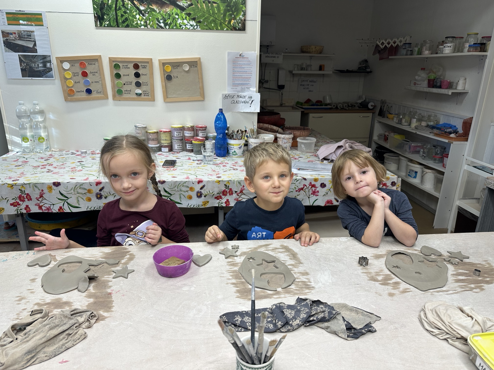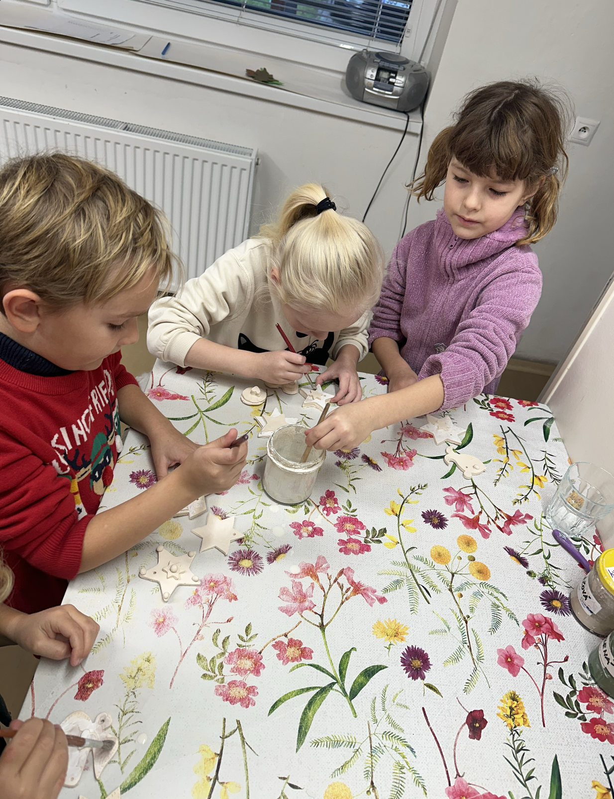 Začátkem listopadu jsme se s dětmi vydali do DDM Domeček, kde jsme si vyzkoušeli práci s keramickou hlínou. Děti se seznámily s tím, jak je hlína tvárná, jak se dají jednotlivé kousky lepit k sobě a jak vznikají různé tvary. S velkým nadšením si vytvořily vánoční ozdoby na stromeček, které si pečlivě zdobily podle vlastní fantazie.