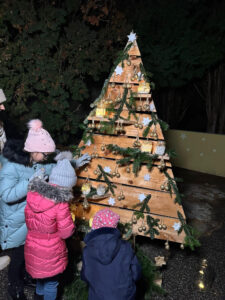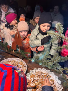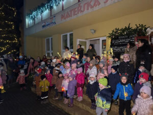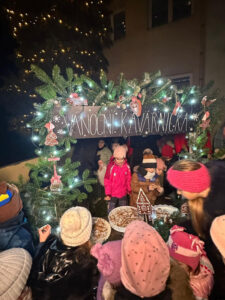Děti ozdobily vánoční stromeček před školkou vlastnoručně vyrobenými ozdobami, zatímco zvoněním na zvoneček si šeptaly svá tajná přání. Paní kuchařky připravily občerstvení a nabídly napečené dobroty, které všechny potěšily. Na rozloučenou si každý odnesl zlatý oříšek jako milou vzpomínku na tento kouzelný adventní večer.