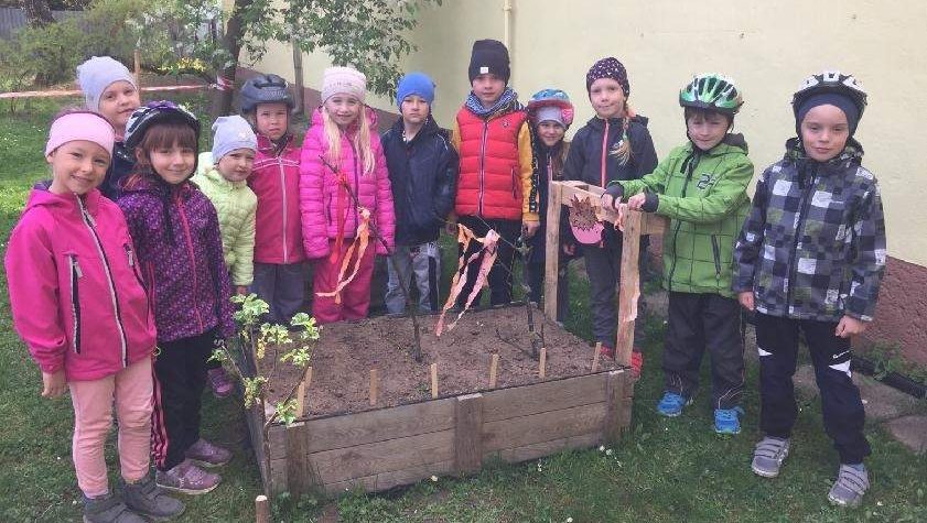 Každá třída má svůj záhonek. Děti je poctivě okopaly a vyčistily od klacíků a suché trávy. Využily poznatky ze své rodiny a radily se, co která třída na záhonek vysadí. Zasadily ředkvičky, hrách, cibuli, kedlubny, jahody a také květiny. Záhonek každý den kontrolují, zalévají a občas okopou.